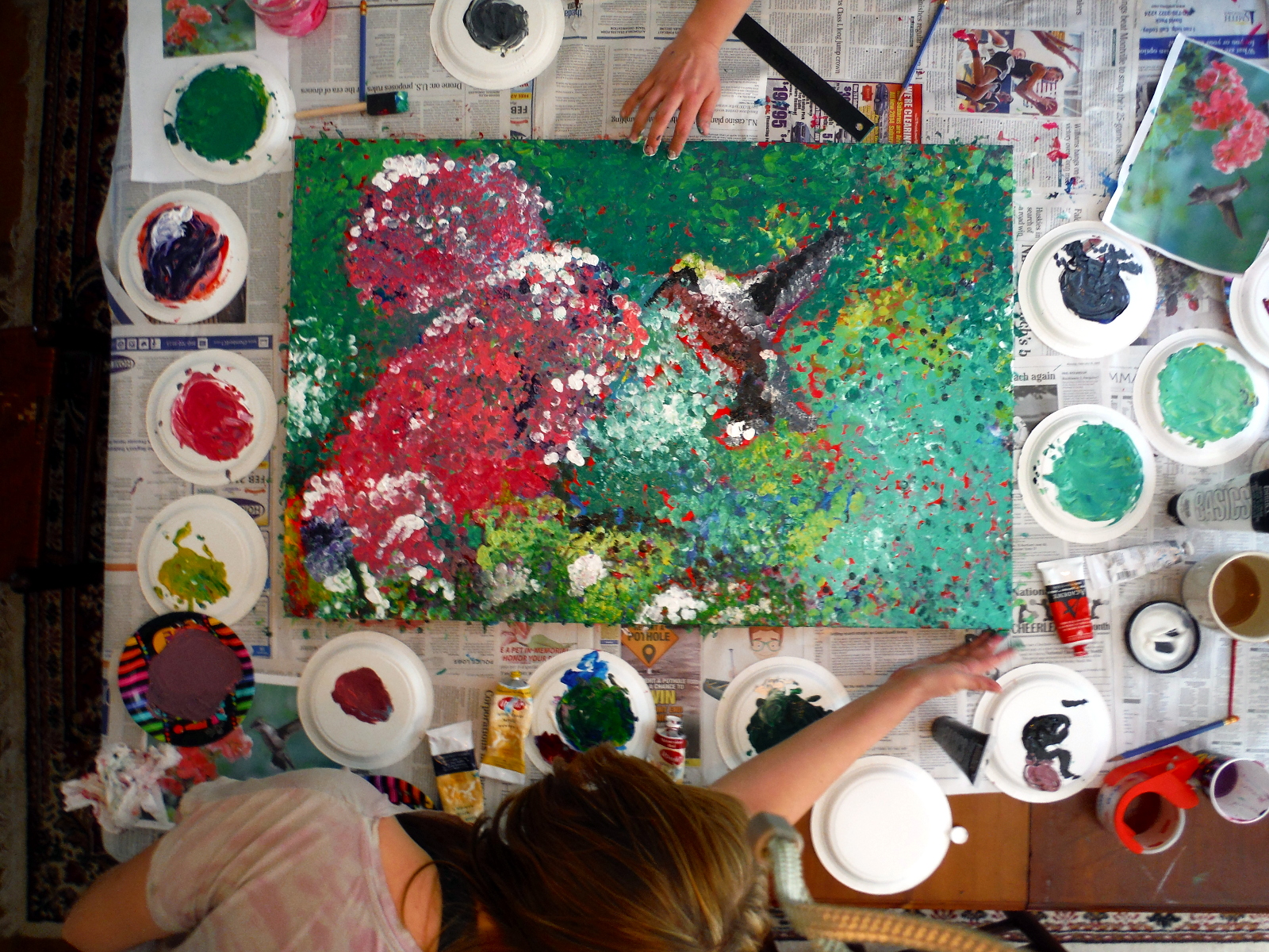 Painting Today we made a painting of a humming bird and we made it from our fingerprints. it took only about half of and hour and when we were almost done we found tucker in a basket. our painting tucker… in a basket
